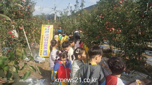 “와! 사과다. 엄청 빨갛다!”를 시작으로 ‘예쁘다’, ‘크다’, ‘많다’ 등 끊임없이 재잘거리며 선생님과 친구들과 같이 사진도 찍고 따기도 하고 맛도 보고 즐거운 시간을 가졌다.