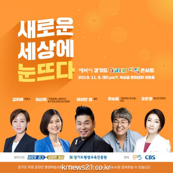 ‘새로운 세상에 눈뜨다’를 주제로 진행된 콘서트에는 도민 500여 명이 참석할 예정이며, 이신혜 경기도청 공정소비자과 과장, 유은정 정신과 전문의, 레이먼킴 셰프, 김지예 변호사, 최승필 작가 등 5인의 강연자가 연사로 나선다.