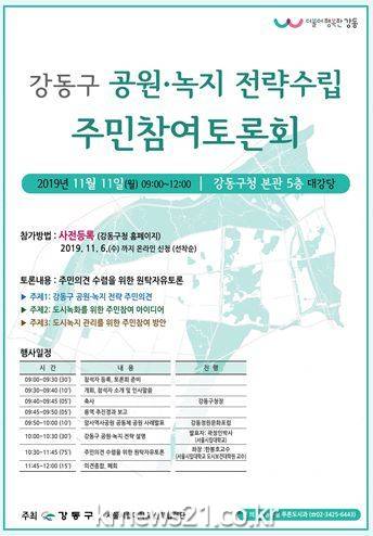 토론회 참석은 강동구청 홈페이지에서 선착순으로 사전등록 후 가능하고 관련 문의는 강동구청 푸른도시과(☎02-3425-6443)로 하면 된다.