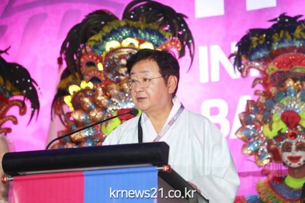 세계탈문화예술연맹 회장인 권영세 안동시장이 개막인사를 하고 있다(안동시 제공)