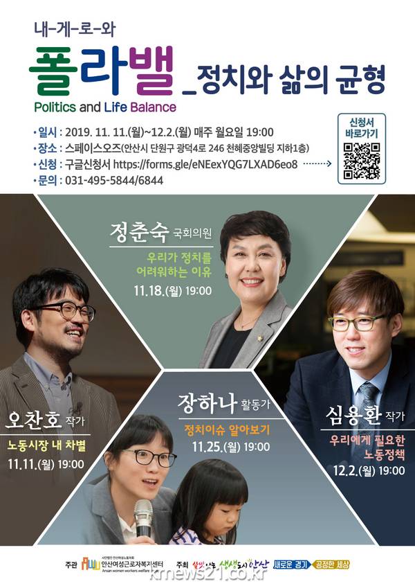 안산시(시장 윤화섭) 여성 근로자복지센터는 정치를 어려워하는 시민들을 대상으로 정치 대중강연 ‘폴라밸(Politics and Life Balance)’을 진행한다고 7일 밝혔다.