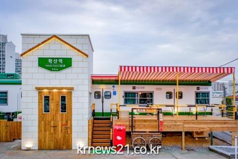 ‘학산역’은 퓨전술집으로 조용한 기차 안에서 담소를 나누고 추억을 이야기하는 술집의 분위기이다. 매장안의 별도 단체룸은 기차 역사 매표소 분위기를 연출해 인싸(인사이더 insider)들의 인증 셀카 장소로 많은 예약을 차지하고 있다. 또한 매장 안 외부에 옛 추억의 소품들과 포토존이 따로 마련되어 있어 20대의 눈길까지 사로잡았다.