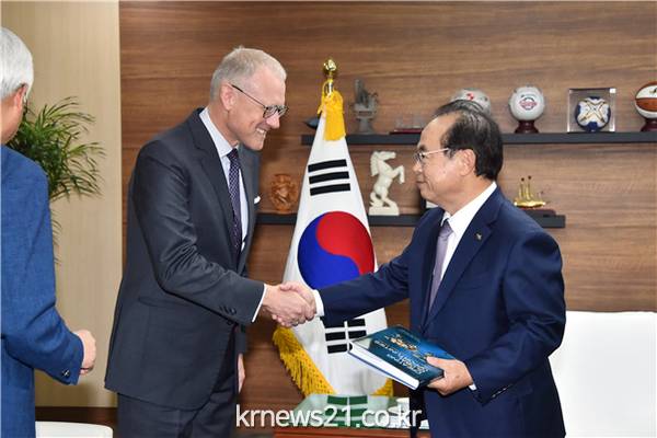 오거돈 부산시장은 7일 오전 시청 국제의전실에서 세계 1위 해운물류기업인 AP 묄러-머스크 그룹 르네 필 페더슨(Rene Pill Pedersen) 한국·동남아시아지역 대표를 만나 신북방경제의 가교도시이자 물류허브인 부산의 미래비전과 발전전략을 공유하고 머스크 그룹과 부산시의 긴밀한 관계 및 부산항만공사와의 파트너쉽 구축과 관련해서 논의했다.