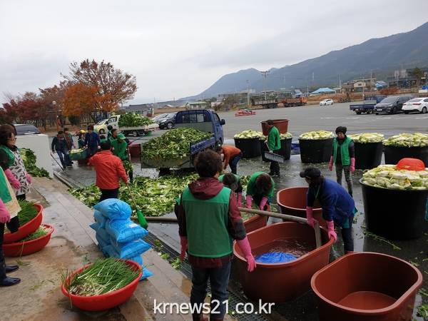 이번 행사에는 16개 읍면동 새마을지도자와 부녀회장 등 모두 80여 명이 참여한 가운데 지역에서 생산된 배추 1200포를 구입하여 13일에는 배추 절이기와 채소다듬기를 실시했다.