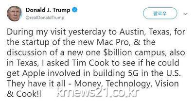 트럼프 대통령은 21일(현지시간) 트위터를 통해 "팀 쿡 애플 최고경영자(CEO)에게 애플이 미국의 5G 구축에 관여할 수 있는지 봐달라고 했다"면서 "그들(애플)은 모든 것을 갖고 있다. 돈, 기술, 비전, 그리고 쿡도 있다"고 덧붙였다.