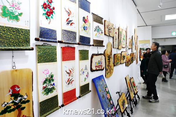 ▲ 심원마을 민화전시회 장면보령시는 지난 23일 보령문화의전당 기획전시실에서 제1회 심원마을 이벤트전 ‘민화, 심원마을에 꽃 피우다’전시회 오프닝 행사를 갖고 오는 27일까지 전시회를 개최한다고 밝혔다.