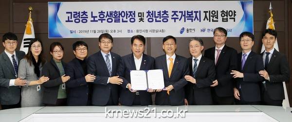 용인시는 28일 시장실에서 주택연금 가입 주택의 일부 공간을 관내 대학생들이 이용할 수 있도록 연계해주기 위한 ‘고령층 노후생활 안정 및 청년층 주거복지 지원 협약’을 체결했다고 밝혔다.