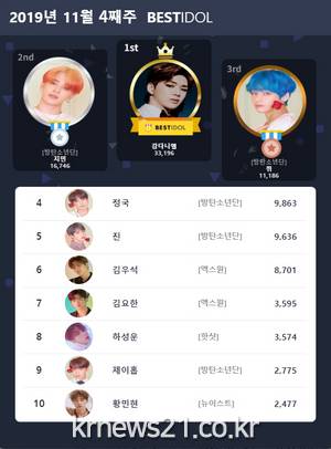 투표 마지막 날까지 치열했던 4위 자리는 방탄소년단의 정국이 지켜냈으며, 5위는 방탄소년단의 진이 저번 주보다 1계단 상승하며 차지했다.