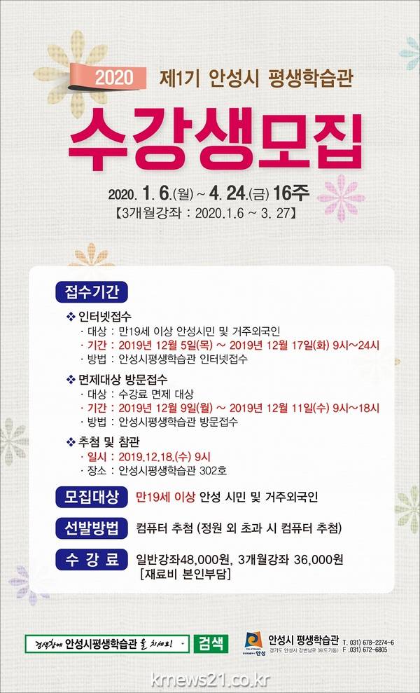 안성시는 오는 5일부터 2020년 제1기 평생학습관 수강생 1,303여명을 모집한다.