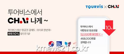 투어비스 이용자는 차이 결제 시 최대 10% 할인 혜택을 받을 수 있다. 투어비스에서 항공권 결제 시 차이를 이용하면 기존 상품가에서 최대 10% 할인된 운임으로 구매할 수 있다. 최대 할인 금액은 건당 10만원이며 결제 횟수는 제한이 없다.