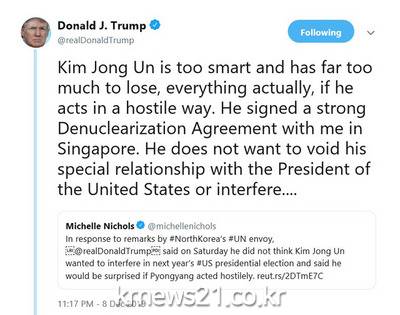 트럼프 대통령은 이날 트위터에서 “적대적인 행동을 하기에 김정은은 너무 똑똑하고 너무 잃을 게 많다”며 “사실상 모든 것(을 잃을 것)”이라고 썼다. 이어 “그는 싱가포르에서 나와 강력한 비핵화 협정에 서명했다”며 “그는 미국 대통령과의 특별한 관계를 무효화 하거나 11월에 있을 미국 대선에 간섭하고 싶어 하지 않는다”고 했다.