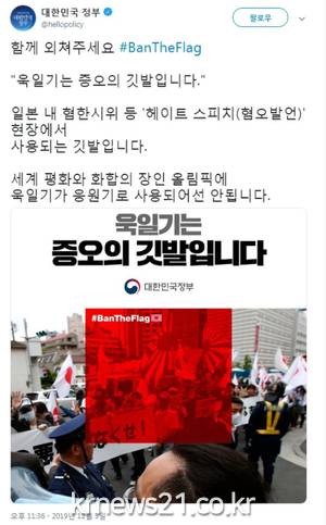 지난 5일 정부는 트윗을 통해 2020년 도쿄 올림픽에서 욱일기를 금지해야한다고 강조하며 "(욱일기는) 일본 내 혐한시위 등 '헤이트 스피치(혐오발언)' 현장에서 사용되는 깃발이다. 세계 평화와 화합의 장인 올림픽에 욱일기가 응원기로 사용되어선 안된다"고 글을 올렸다. 나아가 "욱일기를 금지하라"는 해시태그(#BanTheFlag)도 덧붙였다.