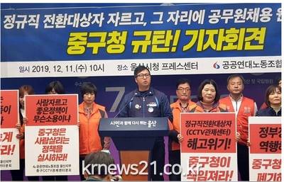 민주노총 울산지역본부, 공공연대노조 울산지부는 12월 11일 오전 10시 울산시청프레스센터에서 기자회견을 열어 "중구청은 비정규직 일자리를 빼앗는 정책을 당장 중단하라"며 "정규직 전환 대상자를 자르고, 그 자리에 공무원 채용이 웬말이냐"며 정규직전환지침과 용역근로자 보호지침을 위반하고 정부정책에 역행하는 중구청을 규탄했다.