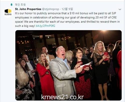 ▲ [사진출처 = 세인트 존 부동산 트위터]미국의 한 부동산 회사가 송년회에서 1,000만 달러(약 119억 원)를 깜짝 보너스로 직원들에게 나눠줘 화제다.