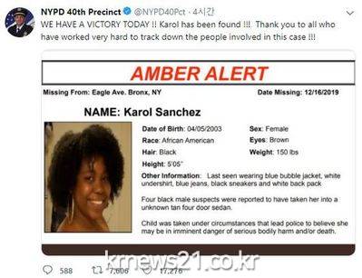 ▲ [사진출처 = 뉴욕경찰 트위터]미국 뉴욕 브롱크스의 대로변에서 16세 소녀가 괴한들에게 납치되는 사건이 발생해 미국이 충격에 빠졌다. 이후 소녀는 안전한 상태로 발견됐으나, 사건 자체가 소녀의 자작극이었음이 밝혀졌다.