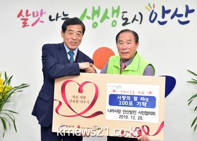 ▲ [사진제공 = 안산시]안산시(시장 윤화섭)는 20일 나라사랑안산발전 시민협의회로부터 저소득 소외계층에게 전달해 달라며 ‘사랑의 쌀’ 4㎏ 100포를 기탁 받았다.