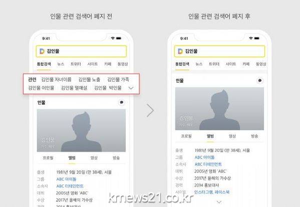 또 포털 다음·카카오톡 #탭에서 제공하는 인물 관련 검색어 서비스를 없애고 검색어 자동 완성 기능(서제스트)을 개편한다. 지난 10월 연예뉴스 댓글 잠정 폐지에 이은 뉴스 및 검색 서비스 개편 계획의 일환이다. 개인의 인격과 명예, 사생활을 보호하기 위한 결정이다.