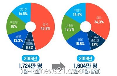 특히, 2019년 시장별 외래객 비율을 2016년과 비교하면 중국 의존도가 감소하고 중국을 제외한 모든 권역이 증가해 방한 시장 다변화를 이룬 것을 볼 수 있다. 이는 정부와 관광업계가 함께 노력한 결과라서 의미가 깊다.