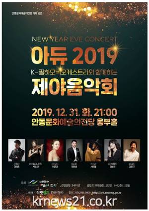 ▲ [사진=홍보포스터]따스하던 봄, 길면서도 즐거웠던 여름, 하염없이 높은 하늘만 보여준 가을, 그리고 하얀 눈꽃을 기다리는 겨울을 보내는 연말을 맞아 올 한해 많은 일이 있었고 잊지 못할 순간들을 돌아보고 다가오는 새로운 2020년의 새로운 시작을 함께하고자 안동문화예술의전당은 31일 저녁 9시 웅부홀에서 ‘K-필하모닉오케스트라와 함께하는 아듀 2019 제야 음악회’를 진행한다.