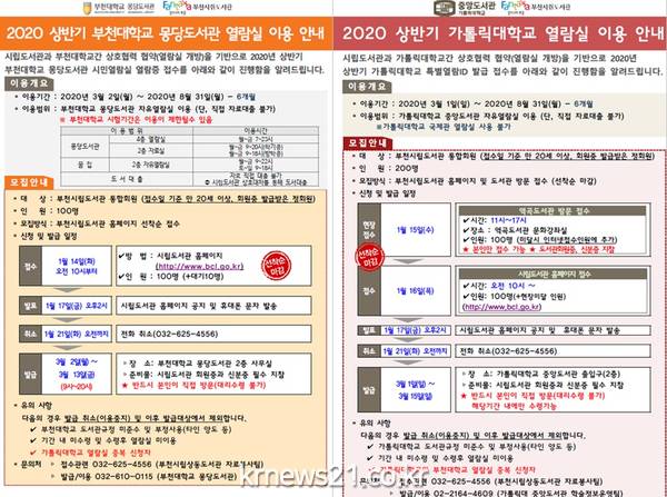 부천대학교 열람실을 이용하고자 하는 부천시민은 1월 14일부터 부천시립도서관 홈페이지에서 신청하면 되고, 선착순으로 100명을 모집한다. 가톨릭대학교 열람실은 1월 15일에 1차로 부천시립역곡도서관에서 100명을, 1월 16일부터 2차로 부천시립도서관 홈페이지에서 100명을 모집한다.