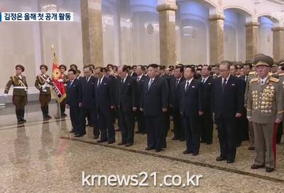 ▲ [사진출처 = KBS뉴스 캡처]김정은 북한 국무위원장이 새해 첫 공개활동으로 김일성 주석과 김정일 국방위원장의 시신이 안치된 금수산태양궁전을 찾았다. 이날 참배에는 최룡해 국무위원회 제1부위원장과 김재룡 내각 총리 등 당 간부들이 함께했다.