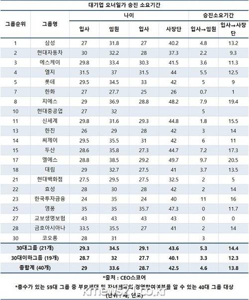 사장단까지의 승진 속도도 하위 그룹이 12.3년으로, 30대 그룹(14.4년)보다 2.1년 더 빨랐다.