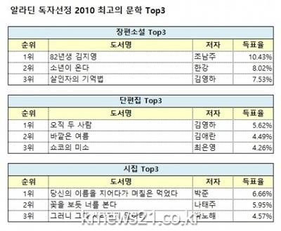 한편 알라딘은 2010년대 한국문학 소설/시 투표에서 최고의 작품으로 꼽힌 분야별 Top20 도서 포함, 소설/시/희곡 3만원 이상 구매 고객에게 2020 한국문학 독서 기록장을 증정하는 이벤트를 진행한다. 자세한 사항은 알라딘 홈페이지를 통해 확인할 수 있다.