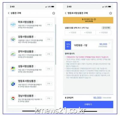 상품권은 모바일 형태로 발행되며, 권종은 1만원, 5만원, 10만원 세 종류다. 1인당 자치구별로 월 50만원까지 할인 구매가 가능하며, 각 자치구에서 발행된 상품권은 해당 구에서만 사용이 가능하다.