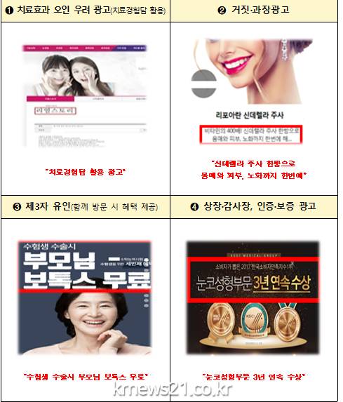 특히, 미용 성형 및 시술 체험담 형식을 활용한 의료광고는 소비자가 치료효과를 잘못 인식하게 만들 우려가 크고, 청소년 등에 미치는 영향이 크다는 점에서 더욱 큰 경각심이 요구된다.