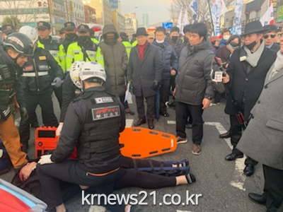 태극기 집회 행진 대열에 있던 한 목격자는 “합법적으로 거리 행진을 하던 중 차량이 행진대열로 들어와 집회 참가자들을 밀어버렸다”고 말했다.