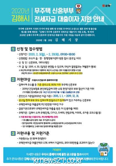 시 관계자는 “신혼부부 주거안정을 위해 무주택 신혼부부 전세자금 대출이자 지원사업을 계속 시행할 것”이라며 “결혼해서 살기 좋은 행복도시 김해가 될 수 있도록 주거복지사업 추진에 최선을 다 하겠다”고 밝혔다.