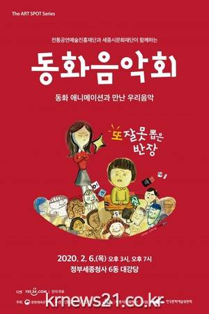 ▲ [사진=홍보포스터]전통공연예술진흥재단(이사장 정성숙)은 애니메이션과 국악라이브가 함께하는 ‘동화음악회-또 잘못 뽑은 반장’을 2월 6일 세종시 정부세종청사 6동 대강당에서 선보인다.