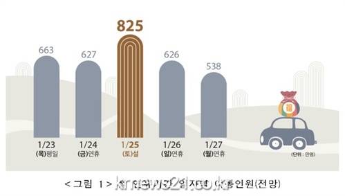한국교통연구원은 이번 설 연휴기간 예상 이동인원은 총 3천279만명으로 설날(25일)에 최대 인원인 825만명이 이동할 것이라는 조사 결과를 내놨다. 하루 평균으로는 작년(하루 623만명)보다 5.3% 증가한 656만명으로 평상시(하루 326만명)의 2배 이상의 규모다.