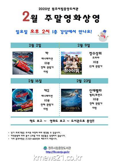 ▲ [이미지제공 = 원주시]원주시립중앙도서관은 시민의 문화생활을 위해 가족영화 및 애니메이션으로 구성된 ‘주말영화’를 연중 운영한다.