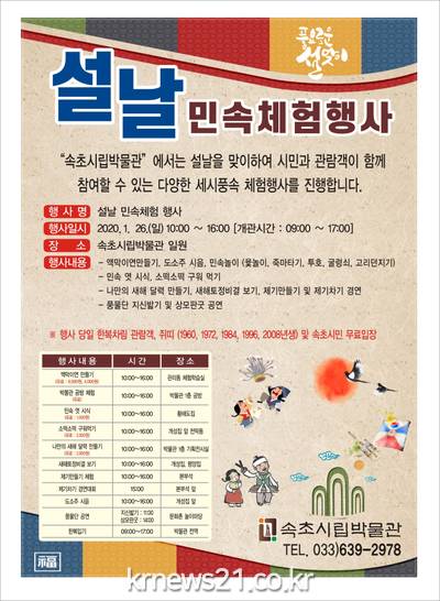 속초시립박물관 관계자는 “민족 최대 명절인 설날 연휴에 가족과 함께 정을 나누면서 박물관 행사에 참여해 전통문화 체험행사를 즐기기 바란다.”면서 “앞으로도 시민과 관람객을 위한 다양한 문화체험 행사를 진행할 예정이다.”라고 말했다.