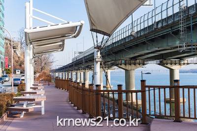▲ [사진제공 = 광진구]광진구(구청장 김선갑)가 광장동 광진정보도서관 앞에 위치한 한강쉼터의 데크와 난간, 휴게시설 등 노후된 시설을 재정비해 올해 1월부터 운영에 들어갔다.