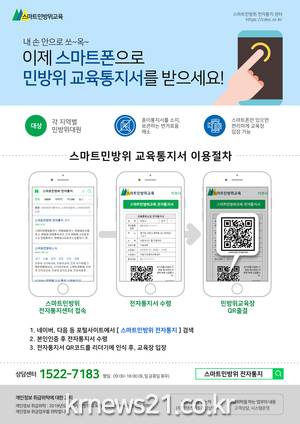 전자통지 시스템은 기존의 종이통지서를 교부하는 방식을 탈피해, 민방위 대원에게 직접 스마트폰(카카오알림톡)으로 민방위 교육·훈련 통지서를 교부하고, 대원이 교육장에 입실할 때 전자통지서에 포함된 QR 코드를 단말기로 인식해 전자 출결하는 방식이다.