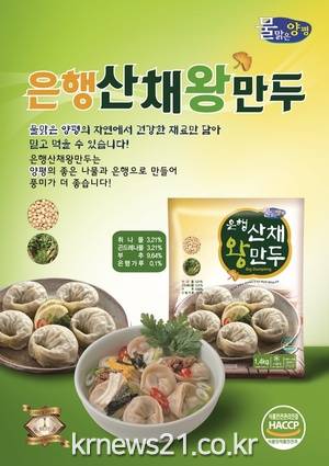 이번 새롭게 출시된 은행산채왕만두는 양평군에서 재배한 산나물을 주재료로 사용한다는 점에서 시판중인 다른 만두 제품과 차별화된다. 은행산채왕만두의 소로 쓰이는 산나물은 단월면에서 채취된 곤드레와 취나물과 양동면의 특산물인 부추가 쓰인다.
