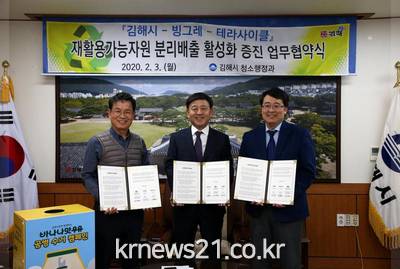 김해시는 3일 오후 3시 시장실에서 ㈜빙그레, 테라사이클코리아와 재활용자원 분리배출 활성화 업무협약을 체결하고 ‘분바스틱 캠페인’을 진행한다고 밝혔다.