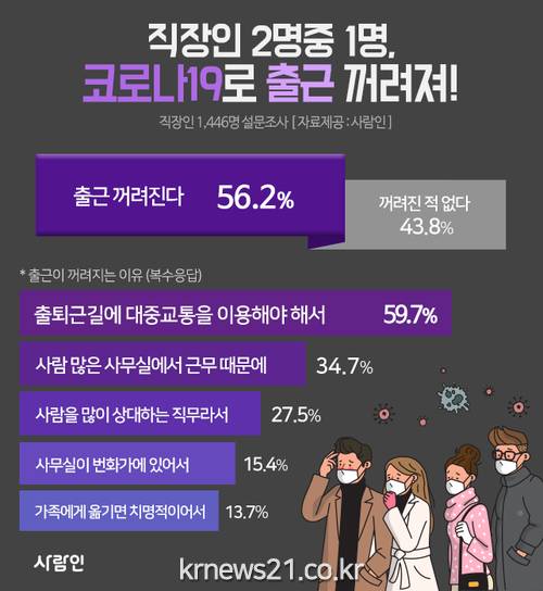 출근이 꺼려지는 이유로는 ‘출퇴근길에 대중교통을 이용해야 해서’(59.7%, 복수응답)가 단연 1위였다. 계속해서 ‘사람 많은 사무실에서 근무해야 해서’(34.7%), ‘사람을 많이 상대하는 직무라서’(27.5%), ‘사무실이 번화가에 위치해 있어서’(15.4%), ‘노부모, 자녀가 있어 옮으면 치명적이어서’(13.7%) 등의 순이었다.