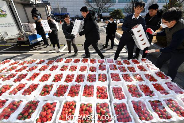 ▲ 수원시 직원들이 18일 진천에서 온 딸기 상자를 내리고 있다. 수원시가 코로나바이러스 감염증-19(이하 코로나19) 사태로 어려움을 겪는 지자체, 기관 등에 도움의 손길을 내밀고 있다.