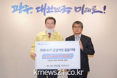 ▲ [사진제공 = 광주광역시]호남 출향기업 ‘㈜시대’가 코로나19로 어려움을 겪고 있는 광주시민들을 위해 손소독제 1만개를 기탁했다.