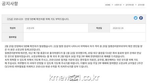 소망교회는 26일 교회 홈페이지 긴급 공지를 통해 “25일 안양에서 5번째 확진자가 발생했다”며 “이분은 소망교회 등록 교인”이라고 밝혔다.