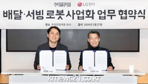 LG전자와 우아한형제들은 27일 서울 송파구 우아한형제들 본사에서 배달·서빙 로봇 관련 사업협력을 위해 업무협약을 맺었다. 협약식에는 LG전자 로봇사업센터장 노진서 전무, 우아한형제들 신사업부문장 윤현준 부사장 등 양사 관련 담당자들이 참석했다.