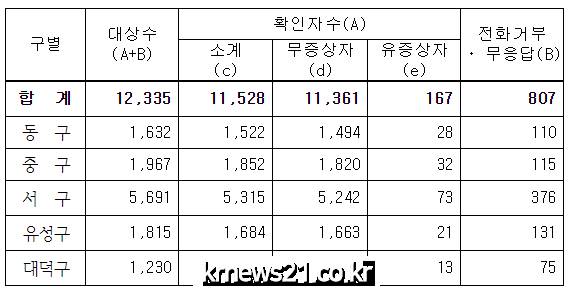 ▲ [조사결과/대전시제공]대전시는 27일 신천지신도 12,335명에 대한 코로나19 증상여부를 조사한 결과, 무증상자는 11,361명(92%), 유증상자는 167명(1.4%), 통화가 되지 않은 신도는 807명(6.6%)으로 조사 되었으며, 응답률은 11,528명으로 93.4%라고 28일 밝혔다.