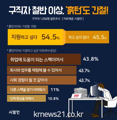 구인구직 매칭플랫폼 사람인(대표 김용환)이 구직자 1,056명을 대상으로 ‘흙턴 지원 의향’에 대해 조사한 결과, 절반 이상인 54.5%가 ‘흙턴이라도 지원하고 싶다’고 답했다.