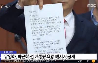박 전 대통령의 변호를 맡은 유영하 변호사는 이날 오후 국회 기자회견에서 현재 서울구치소에 수감 중인 박 전 대통령이 직접 쓴 서한을 공개했다. 서한에는 박 전 대통령은 "서로 분열하지 말고 역사와 국민 앞에서 하나된 모습을 보여주시기 바란다"며 "여러분의 애국심이 나라를 다시 일으켜 세울 수 있다. 저도 하나가 된 여러분들과 함께 하겠다"고 했다.