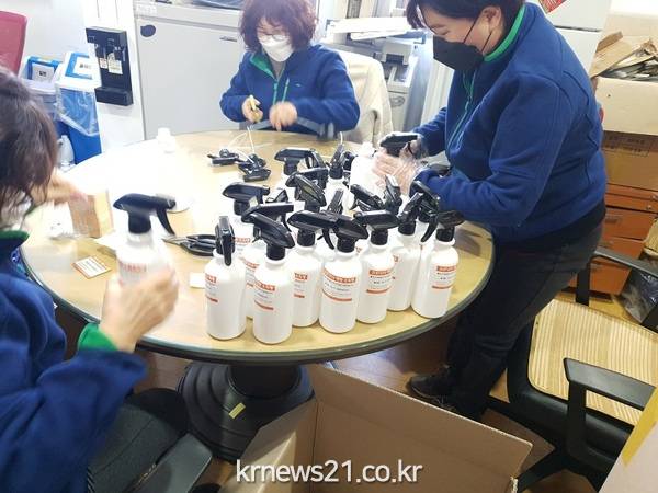 순천시 덕연동 부녀회에서는 코로나19 확산을 차단하고자 염소계소독제 80배를 희석한 용액 500ml 1000개를 만들어 취약계층에 배부했다.