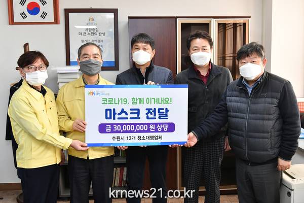 ▲ 지난 3일 수원시 관내 13개 청소 대행업체로 이뤄진 생활폐기물 수집·운반대행업체협회(회장 김홍기)가 수원시에 KF-94 마스크 8550개(3000만 원 상당)를 기부했다“아이가 모아둔 용돈으로 간식을 사서 수원의료원에 보냈습니다.”