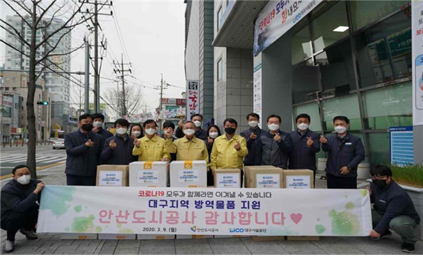 안산도시공사는 9일 코로나19 확산으로 어려움을 겪는 대구를 응원하기 위해 520만원 상당의 방역물품을 대구시설공단에 전달했다.